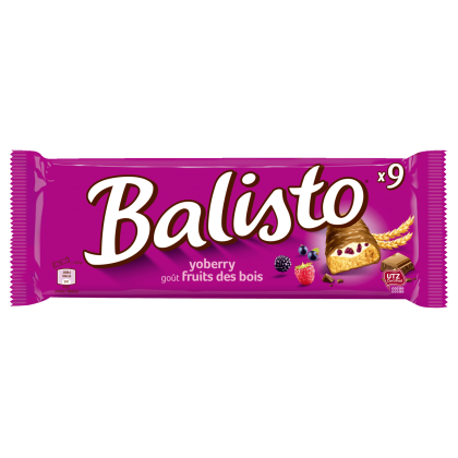 Biscuit cu cereale integrale (36%) și o cremă cu aromă de fructe de pădure, acoperit cu ciocolată cu lapte (39%).