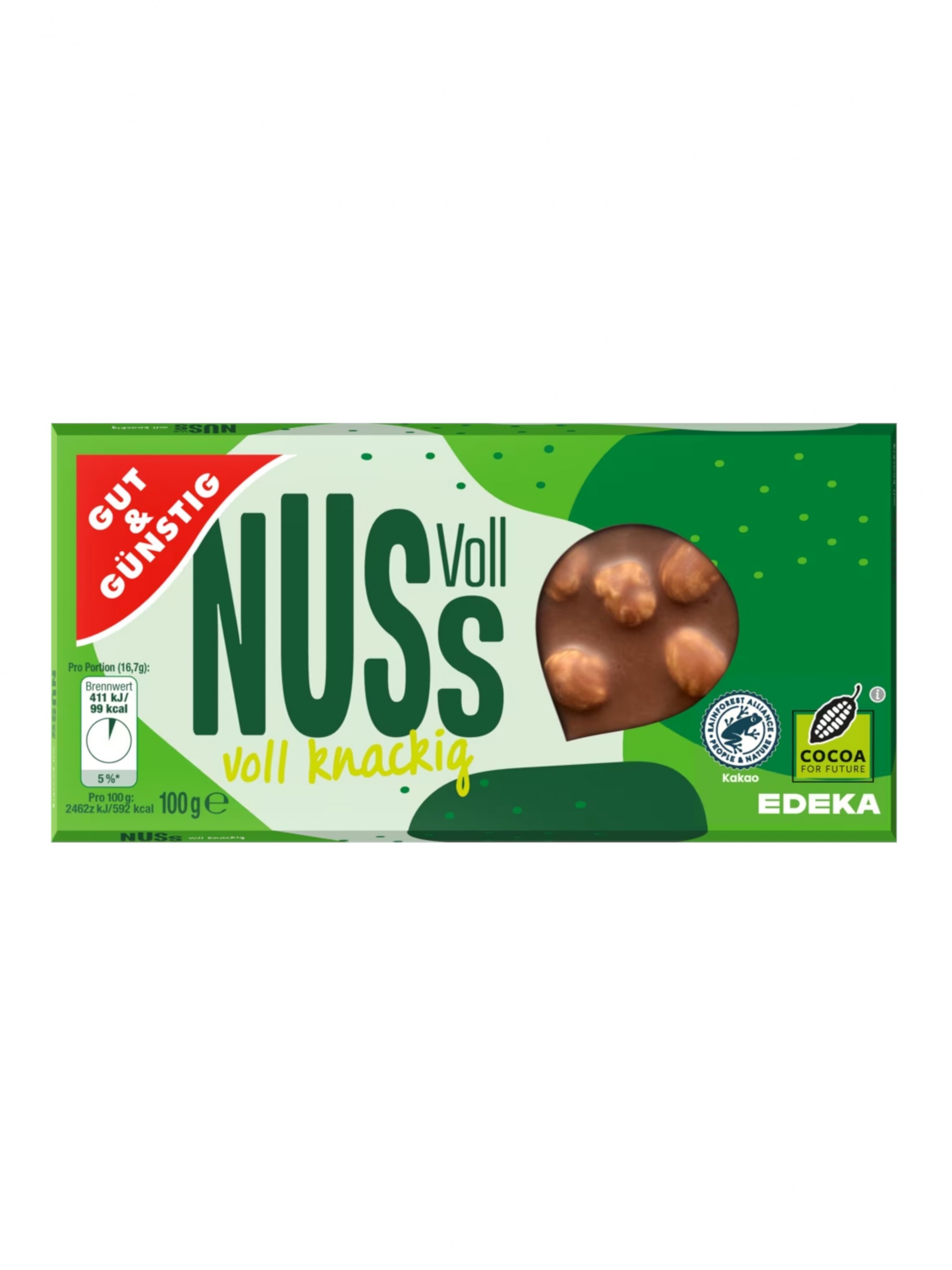 Ingrediente: zahăr, 27% ALUNE intregi, unt de cacao, praf frisca, masă de cacao, LAPTE INTEGRAL, emulgator: lecitine (conține SOIA); extract de vanilie.
