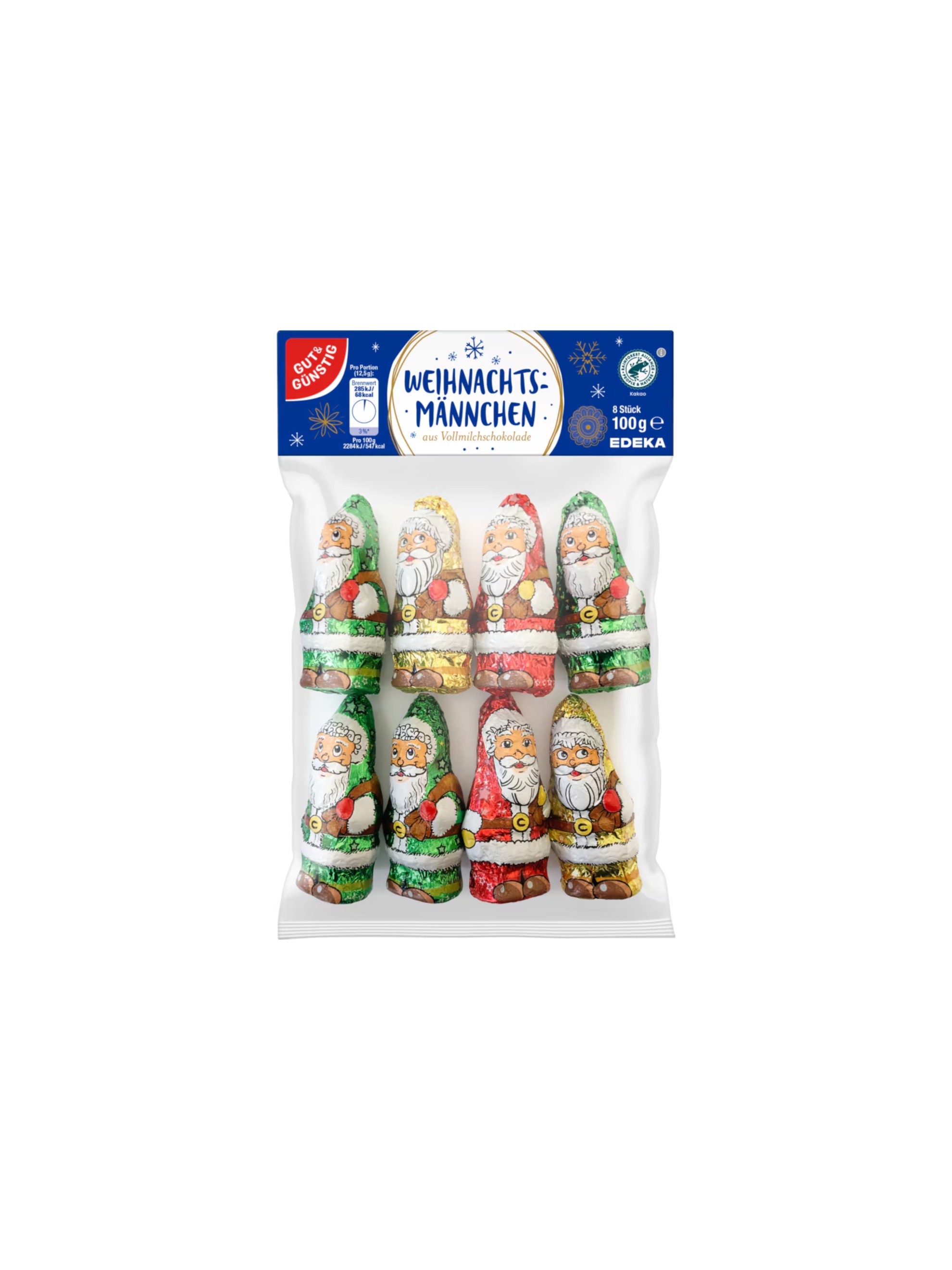 Figurine mici Moș Crăciun din ciocolată cu lapte cu 30% conținut de cacao.
