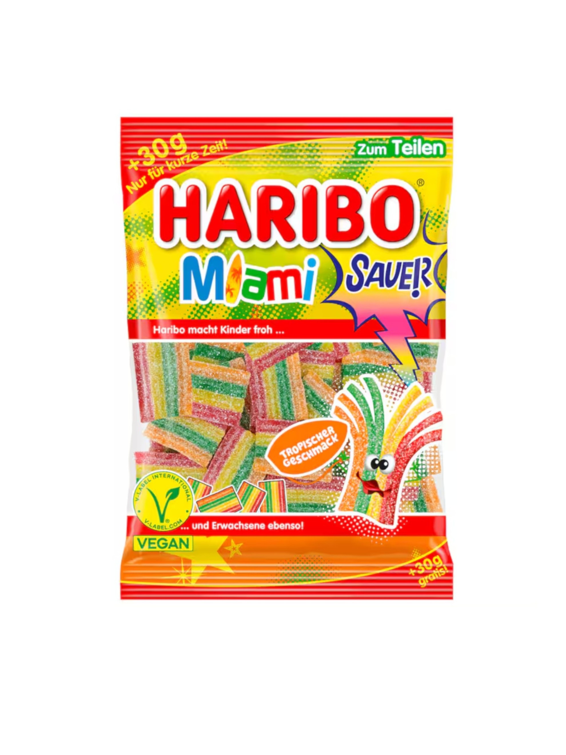 Lasă-te purtat in lumea plajelor nisipoase și a palmierilor cu jeleurile de fructe Haribo Miami Sauer - o explozie de arome răcoritoare si acrișoare.