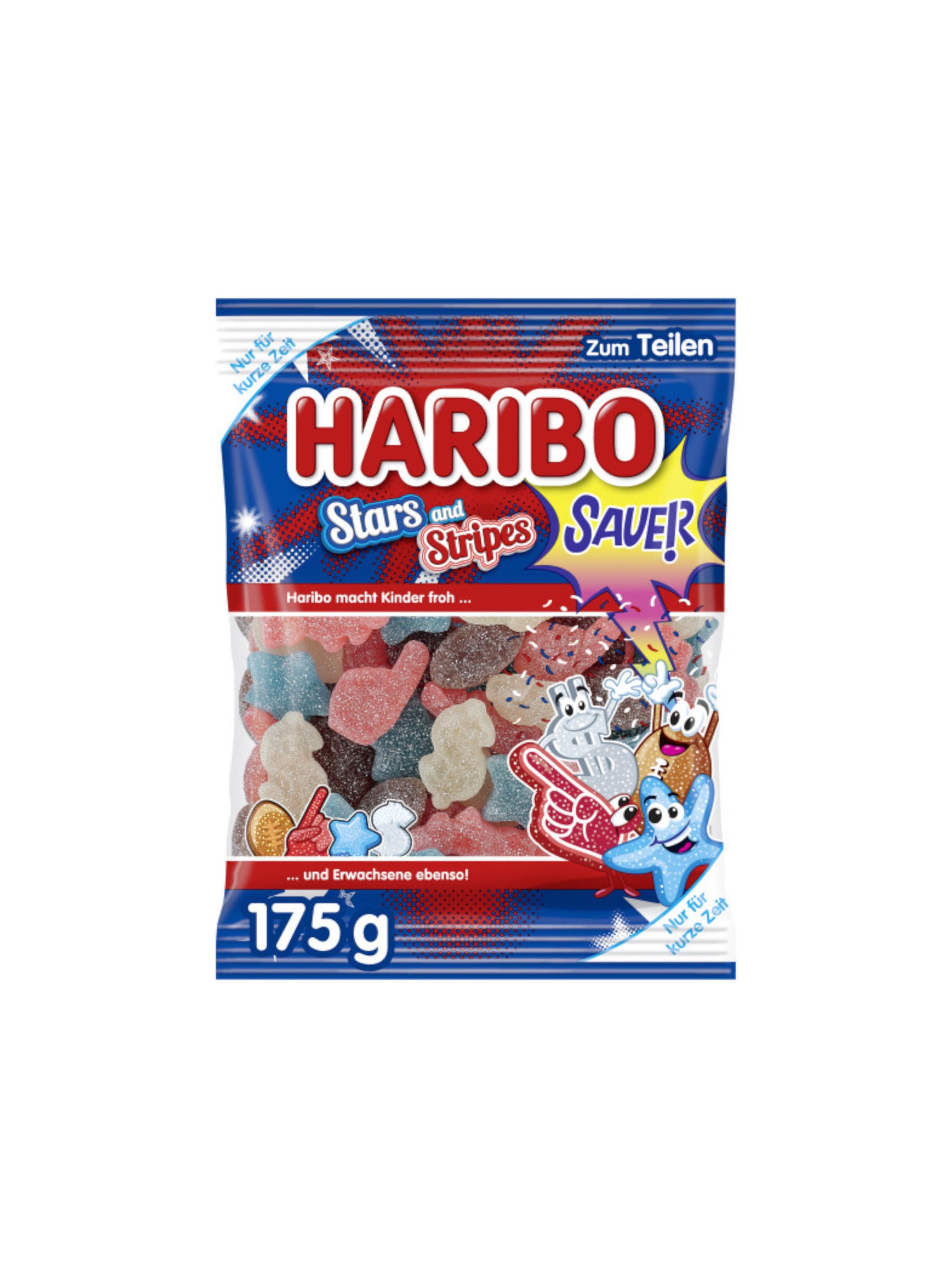 Haribo Stars and Stripes într-un design american, disponibile în aromele răcoritoare de cirese, zmeura lime, lamaie și cola.