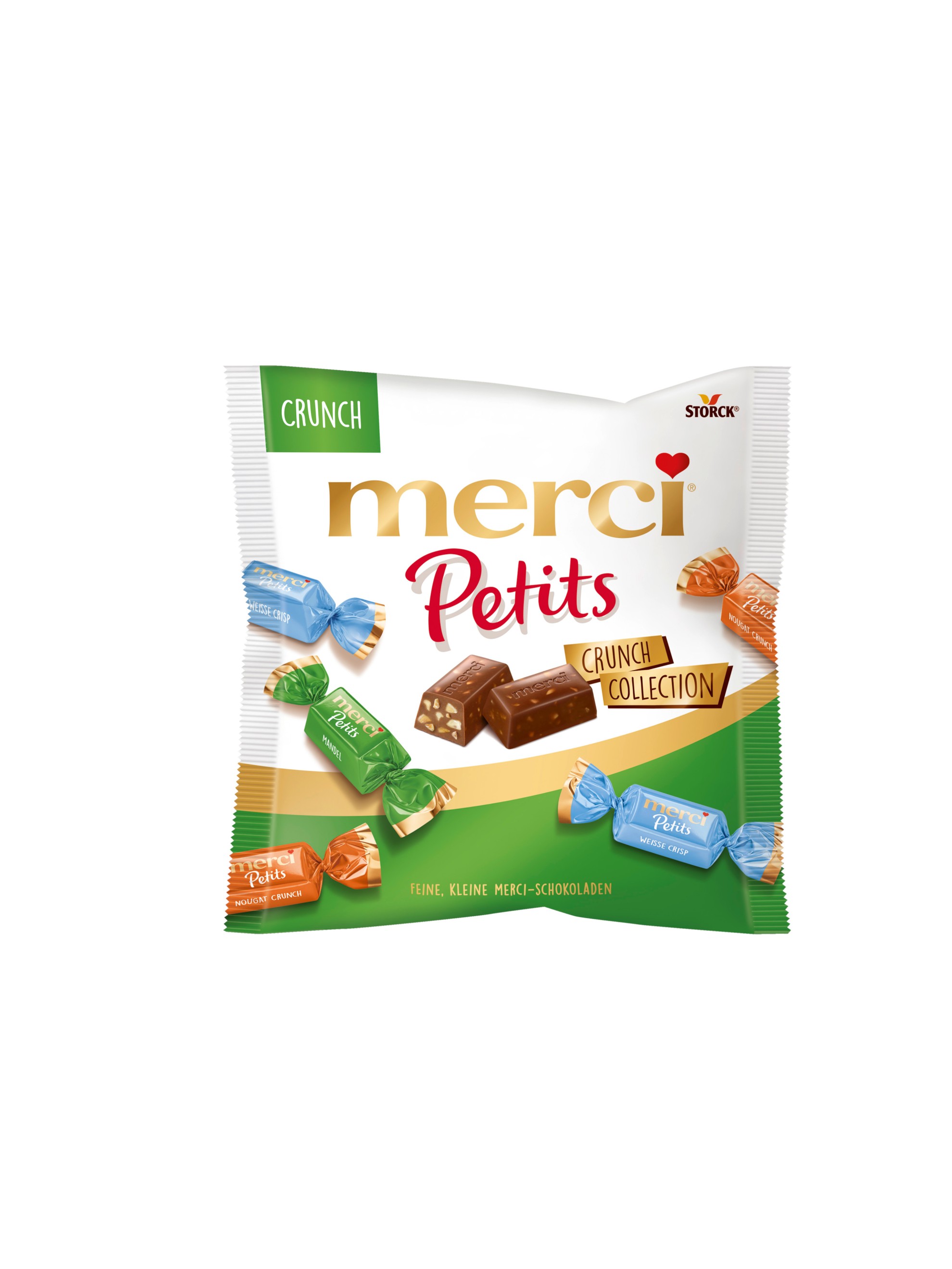 Merci Petits Crunch sunt bomboane de ciocolată mici, ambalate individual, in trei arome delicioase Merci.
