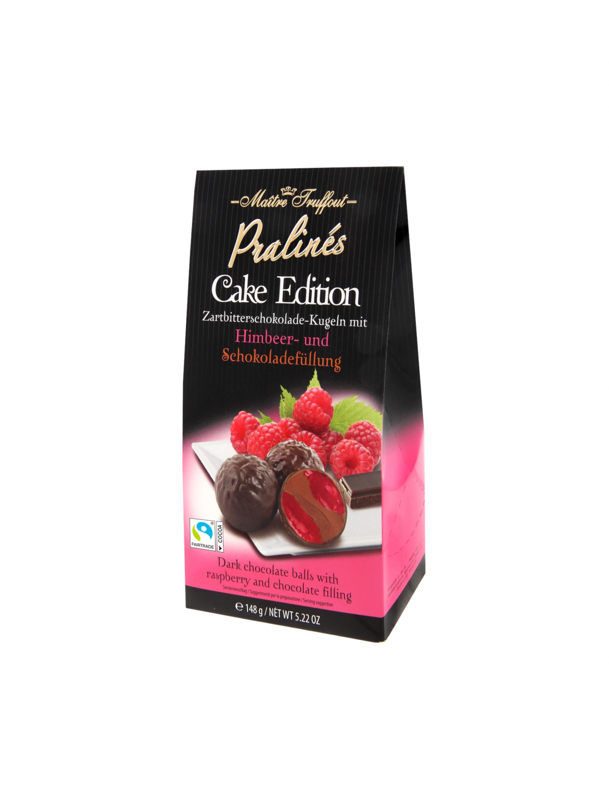 Ciocolata neagra [zahar, masa de cacao, unt de cacao, emulgator: E322 (SOIA); Grăsime din LAPTE, pastă de alune, pastă de ARAHIDE, extract de vanilie], umplutură de ciocolată [zahăr, grăsimi vegetale (palmier, shea; în proporții variate), LAPTE praf integral, masă de cacao, LAPTE praf degresat, unt de cacao, grăsime din LAPTE, emulgator: E322 (SOIA); extract de vanilie], umplutură de zmeură [zahăr, sirop de glucoză, piure de zmeură 14%, umectant: E420; regulator de aciditate: E330; concentrat de suc de morcovi negri, aromă naturală, agent de îngroșare: E440].