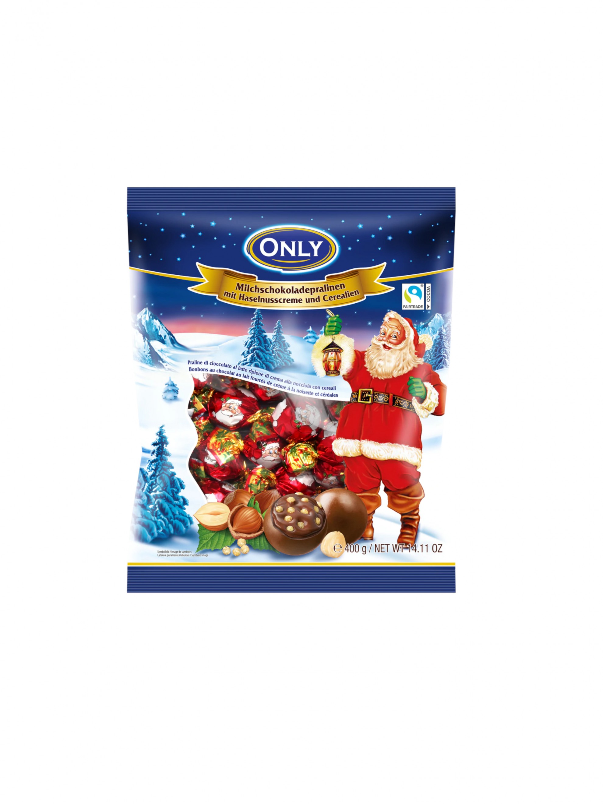 Praline de ciocolata cu lapte cu crema de alune si umplutura de cereale.