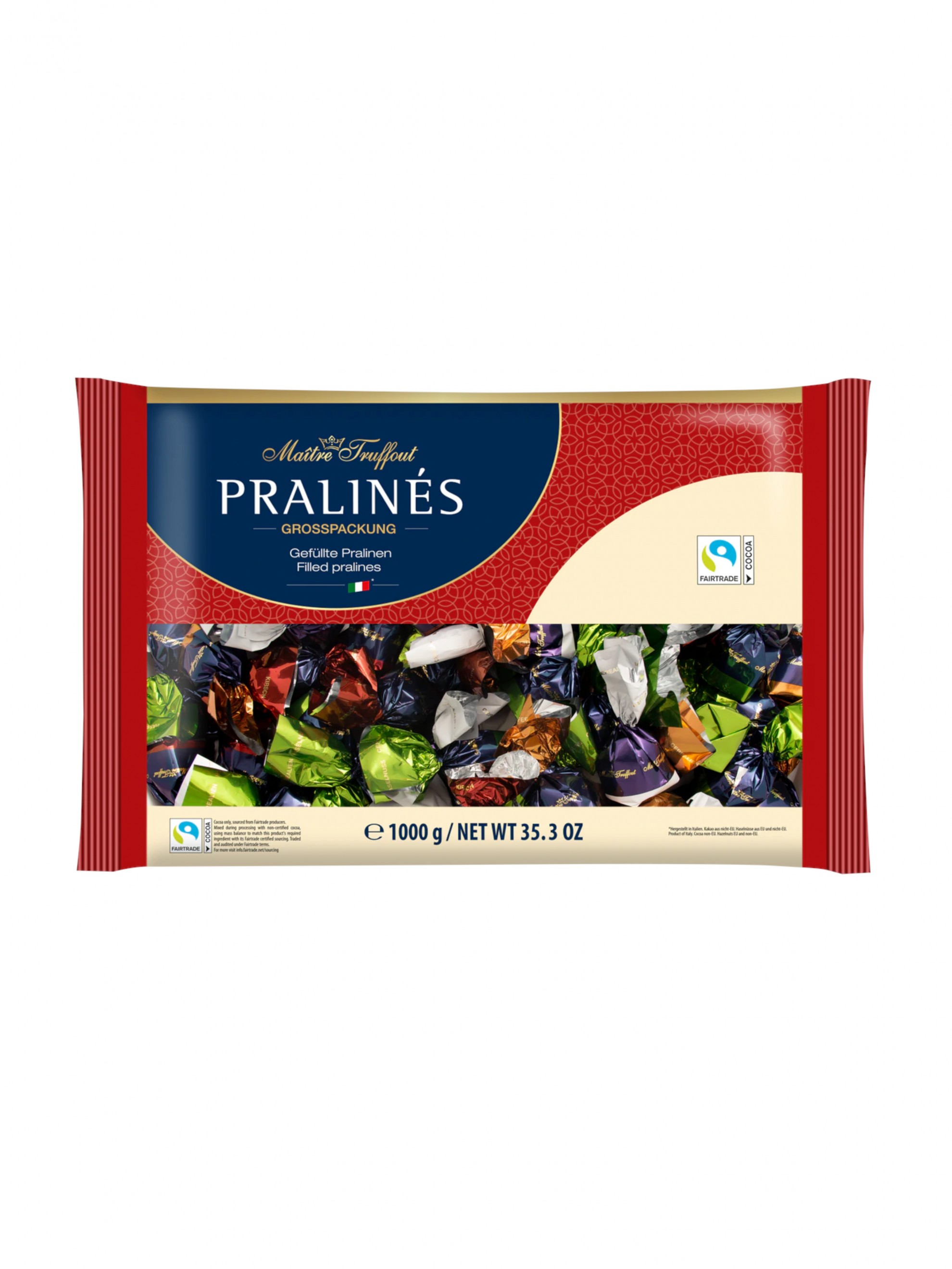 Praline de ciocolată cu lapte cu umplutură de cremă și cereale.